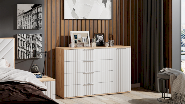 Мебель для спальни непременно должна быть изготовлена из надёжных материалов, именно такой и является комод комбинированный «Хилтон». Каркас выполнен из прочной ЛДСП, а фасады МДФ облицованы пленкой ПВХ и декорированы вертикальной фрезеровкой. Благодаря тщательно подобранной цветовой гамме, комод этой коллекции соответствует современным трендам и актуальным стилям.