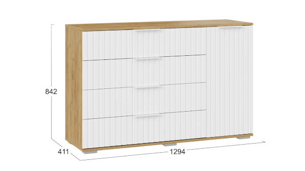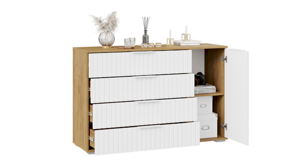 Комод комбинированный Хилтон имеет 4 вместительных выдвижных ящиков, которые позволят использовать 100% внутреннего пространства. За распашным фасадом, расположены вместительные ниши. Их можно использовать для хранения одежды, постельных принадлежностей, полотенец, а также для всевозможных мелких предметов, украшений и прочего.