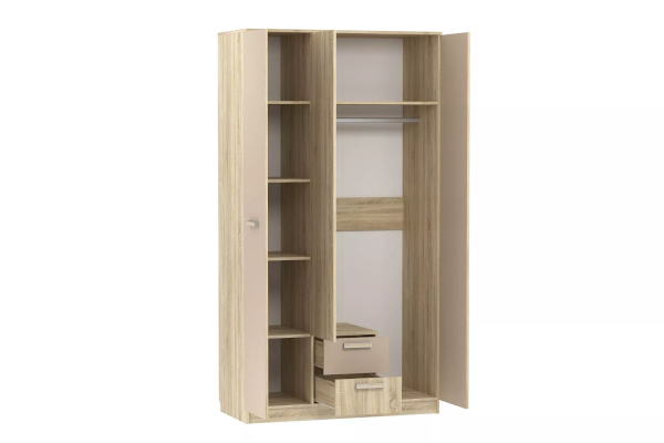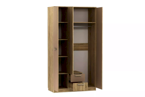 Данный шкаф имеет компактные размеры, но при этом многофункционален. Внутри модуля предусмотрены овальная штанга для одежды на вешалках, в том числе для размещения длинных вещей. Вместительная часть с пятью полками, позволит рассортировать и разместить большое количество вещей.  Два выдвижных ящика внизу идеальны для хранения мелкой одежды. Классические глухие фасады надежно защитят содержимое шкафа от влаги и пыли.