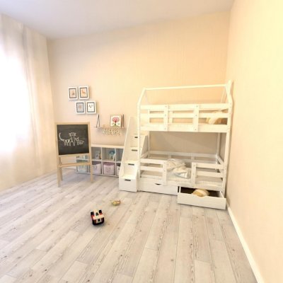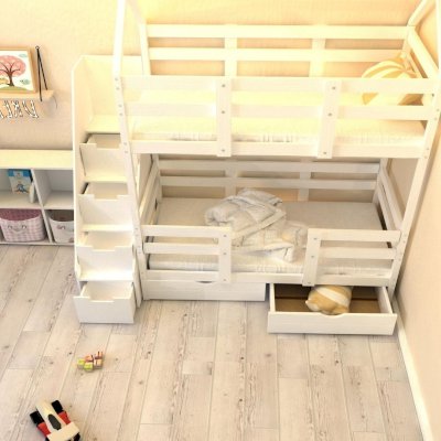 Детская двухъярусная кроватка-домик Classic из сосны с лестницей-комодом из качественного ЛДСП — это лаконичный дизайн, безопасные материалы и краски, качественное исполнение, простота в сборке! Лестница-комод устанавливается с торца кровати и обеспечивает помимо удобного входа на второй этаж кучу места для хранения в выдвижных ступенях-ящиках. Сборка не универсальная - только как на фото.