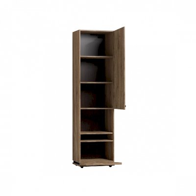 Благородный древесный оттенок шкафа, контрастирующий с черными ручками из массива дерева, подойдет к большинству цветовых решений – мебель будет легко комбинировать с другими предметами. Высокий шкаф МЦН удобен своей функциональностью и эргономичностью конструкции. На открытой полке разместите фотографии или элементы декора, а за глухими фасадами спрячьте документы и ценные вещи от посторонних глаз. Регулируемые опоры шкафа позволят компенсировать незначительные неровности пола.