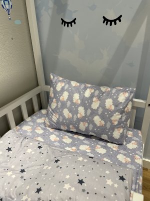 Милые овечки будут оберегать сон ребёнка и сделают процесс засыпания быстрым, а сон крепким. Идеальный комплект как для мальчика так и для девочки.