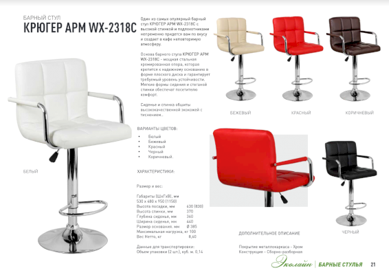Популярный барный стул КРЮГЕР АРМ WX-2318C с высокой спинкой и подлокотниками непременно придется вам по вкусу и создает в кафе неповторимую атмосферу. Основа барного стула КРЮГЕР АРМ WX-2318C - мощная стальная хромированная опора, которая крепится к надежному основанию в форме плоского диска и гарантирует требуемый уровень устойчивости. Мягкие формы сидения и хромированные подлокотники с удобными чехлами обеспечат посетителю комфорт.
