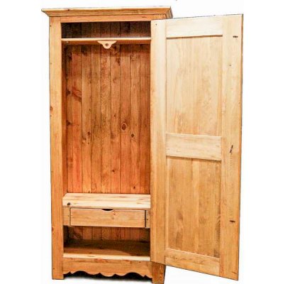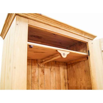 За дверью находится вместительное пространство со штангой и полкой для одежды (штанга прикреплена к верхней полке), а для мелочей имеется выдвижной ящик внизу.