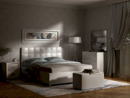 Элегантная интерьерная кровать с изголовьем, украшенным декоративными пуговицами, которые можно заменить на стразы. Модель изготовлена из ДСП. В комплект кровати входит кроватное основание. Каркас основания выполнен из металла, ламели - из берёзы. При необходимости в комплект можно включить подъемный механизм с бельевым ящиком.