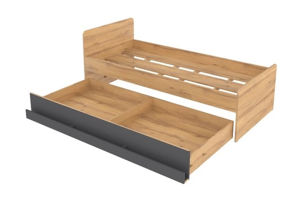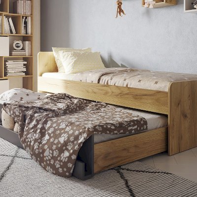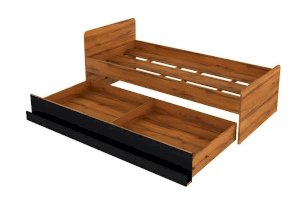 Кроватный ящик открывается за ручку-карман. Такой импровизированный карман дает возможность аккуратно сложить необходимые перед сном вещи: книгу, телефон, любимую игрушку. Выдвижной ящик используйте как место для хранения или как дополнительное спальное место. Если планируется дополнительное полноценное спальное место, достаточно не устанавливать делитель при сборке и приобрести матрас. Рекомендуемый размер матраса для основного спального места - 2000х900 мм, для дополнительного спального места - 1900х800х180 мм. Дно спального места кровати из ЛДСП усилено специальными ребрами жесткости из фанеры 18 мм и рассчитано на нагрузку до 80 кг.