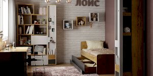 Кровать выполнена как подростковая кровать-тахта с большим выкатным ящиком на роликах. Изголовье и изножье со скругленными углами облицованы ударопрочной кромкой ПВХ 2 мм, что, безусловно, немаловажно для детей и родителей, выбирающих мебель. Обратите внимание, что изножье совсем не высокое и не будет мешать садиться на кровать даже с этой стороны, поэтому кровать можно ставить не только у стены.