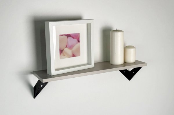 Полка крепится к стене с помощью чёрных треугольных держателей, которые обеспечивают устойчивость и долговечность. Особенность модели в том, что держатели можно расположить сверху, снизу или один сверху, другой снизу, что позволяет адаптировать полку под любые интерьерные решения и потребности.