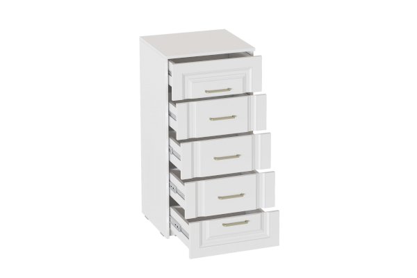 Комод выполнен в цвете Айс 06 / Белый Аляска. Классическая фрезеровка фасадов и ручки-скобы из брашированного золота придают изделию особый шарм и элегантность. Ящики полного выдвижения на шариковых направляющих скользят бесшумно и плавно. Дно и задние стенки выполнены из ХДФ. На опорах размещены войлочные подпятники.