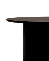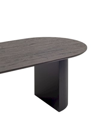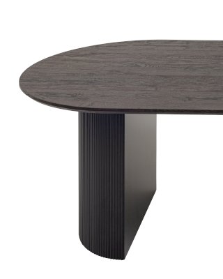Столешница выполнена из прочного и долговечного МДФ. Темная поверхность столешницы гармонично сочетается с массивными ножками черного цвета. Простая овальная форма стола позволит легко вписать его в современный интерьер, стол украсит кухню, гостиную или современное кафе, ресторан. Опорные плиссированные ножки в лаконичном дизайне надёжно удерживают всю конструкцию и дополняют монолитный образ.